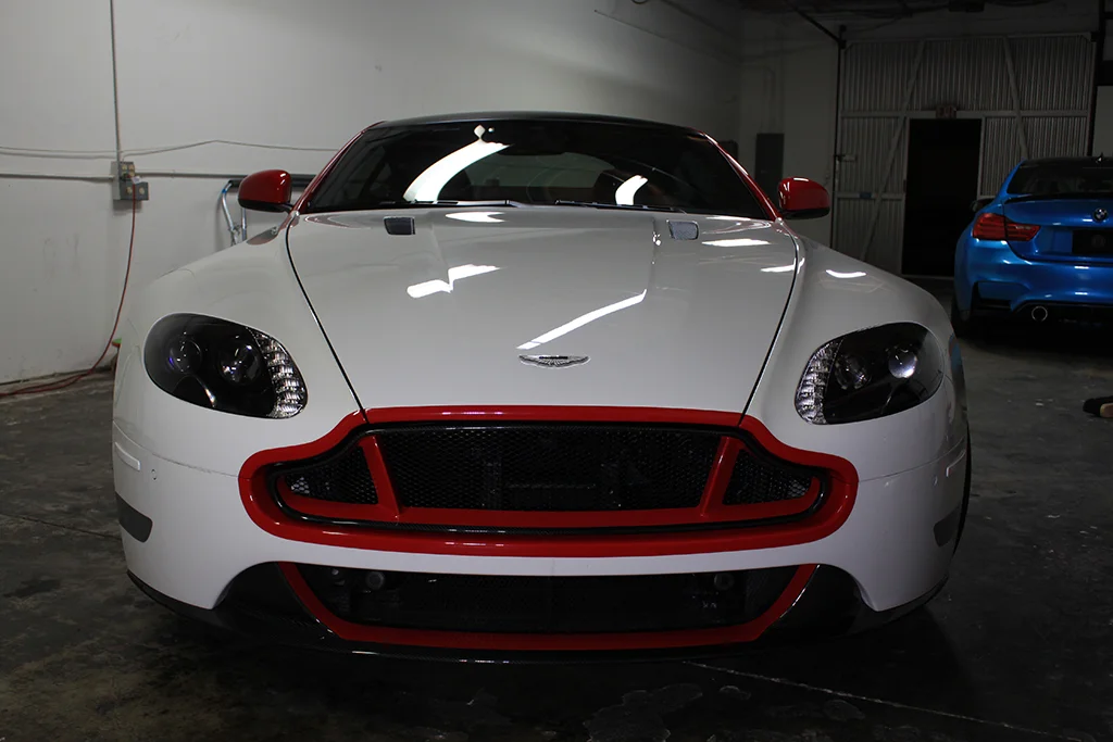 Aston Martin Vantage GT has to be on of the most classic beauties out right now. This one came on for a satin black side skirt wrap and a red side skirt stripe. We also blacked out the center wheel caps with satin black to help complete this subtle yet unique customization. Finished this beauty off with a front lip and diffuser install in which we also added some red accents to. What a gorgeous car! When this car drives by you can't help but to stare.
